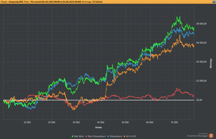 Ну а я отбываю в страну нихуянеделания, потому что сил моих больше нет. В последние дни гонка потеряла всякий смысл, но я продолжал бежать. С высокой вероятностью это самый плотный месяц по сыгранным раздачам так точно. Мне совсем не нравится как я играю, но оно работает. Хотя мне просто сложилось