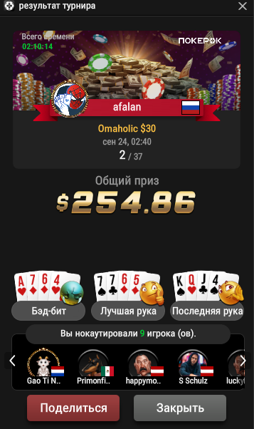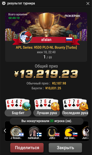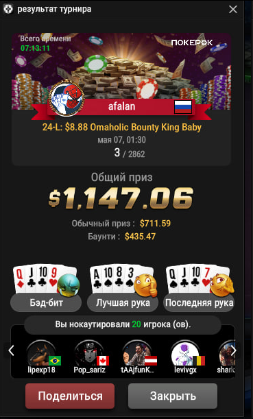 На стриме продавал доли с кэф1 зрителям, и ни в одном турнире (кроме 20$ Bounty) не удалось реализоваться, самое обидное было уйти в моем самом успешном 50$ Deepstack на прямом баббле, когда всю дорогу шел хорошо. В следующий раз точно получится занести зрителям монетку.