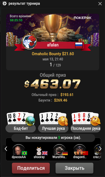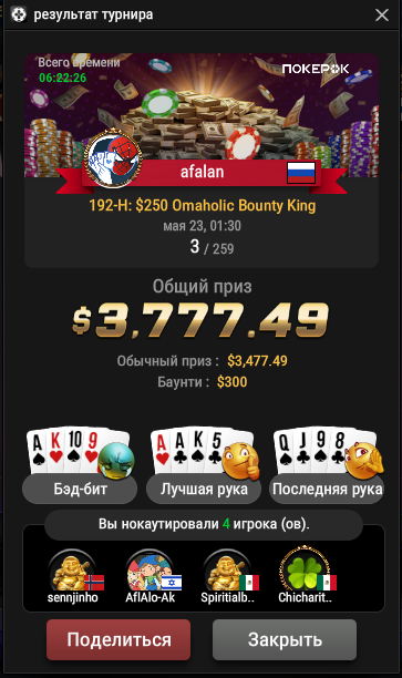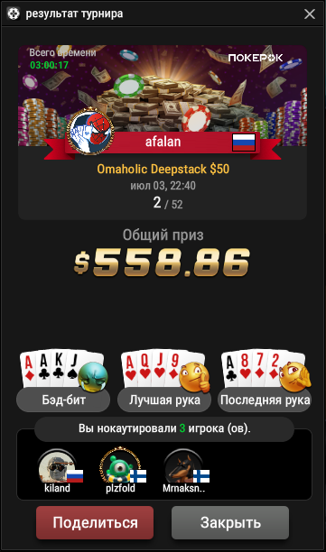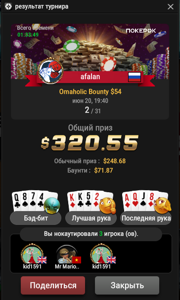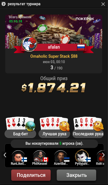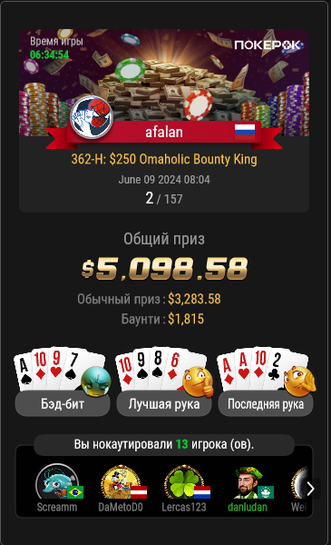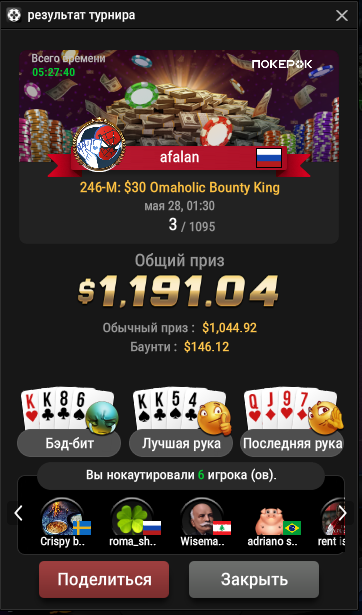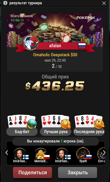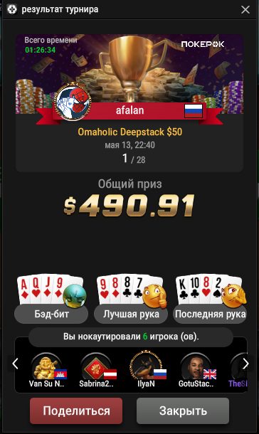 20-26 мая. Возвращаемся в солидный покер турнирной омахи, проработав свою стратегию с новых граней! Отобрался в турнир за 215$ через сателлит за 25$ и занял 3-е место. В воскресенье также довольно хорошо складывалось в дорогих, топ-5 опять же в турнире за 215$, и довольно хорошие дипраны во многих других турнирах (25$ Bounty, 30$ Bounty).