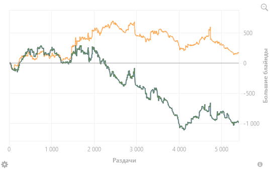 5-11 августа. Моя битва с даунстриком практически достигла отметки в 5 месяцев, и я терплю очередное поражение в этом очень непростом сражении! (Прикрепленный график - поздние стадии турниров с 16 апреля). Не всё дело в вероятностях, на неделе были ситуации, когда сам отгрузил несколько стеков не туда (особенно, плохо подстроился под структуру RedStar), но все же качеством игры доволен, особенно после детального анализа своего лучшего периода карьеры: обнаружил элементы стратегии, которые последние полгода использовал, и они показали плохую отработку, поэтому есть понимание как делать надо и как не надо.