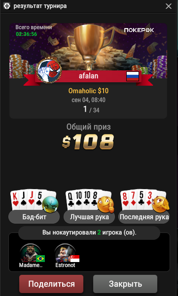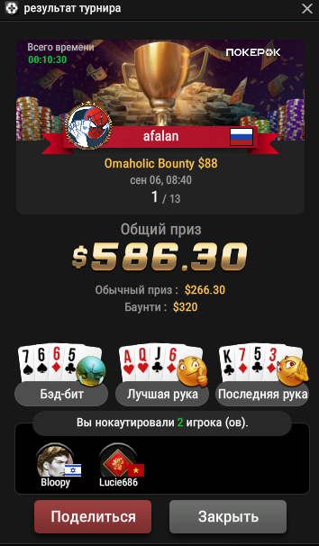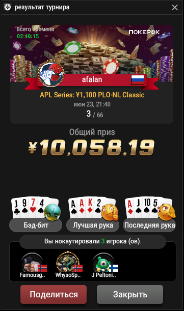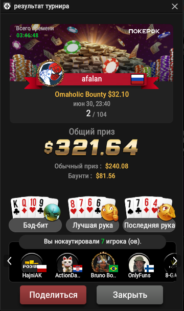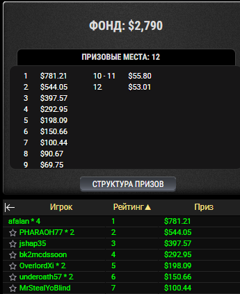 В воскресенье хорошо складывалось и взял топ-2 воскресного турнира за 10$, и топ-3 за 75$. Было большое количества повторных входов в дорогие.