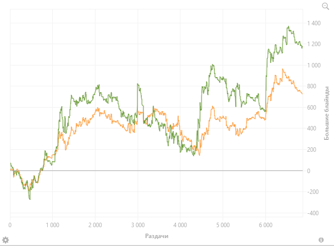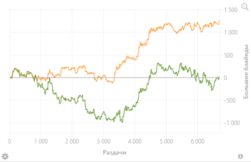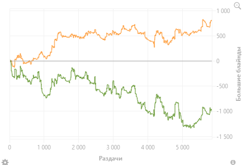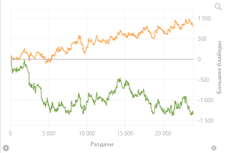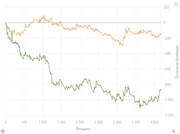 График показательный, дополнительных комментариев не требует. Делай что хочешь, но когда решка падает подряд 3, 5, 10 раз - турниры не выигрываются. Невероятно рад, что минус получившийся по турнирам ВСЕГО 1к$, удалось даже с таким везением зацепить неплохие призы.