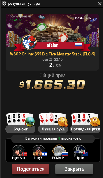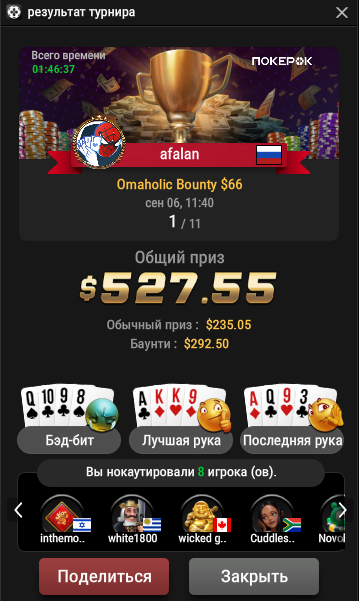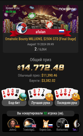 12-19 августа. Результат одного турнира, который стал временно верхом рабочих лимитов, дал мощный импульс, восстановив всё произошедшее за последние 4 месяца. Да, в покере такое бывает, иногда - через джекпот, иногда - через лучший сундук в турнире формата мистери, ну а у меня была серия очень хороших попаданий в борд в этом турнире. Последние 2 недели отирался в Venom PLO через сателлиты за 33$ (тоже турнир формата lifechanger), но дальше фазы за 280$ не проходил. На RedStar свою игру найти никак не могу, сказывается другая структура турниров.