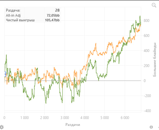 Подключал турниры, довольно неудачно на этой неделе, и точно есть ощущение необходимости отдохнуть от них - по крайней мере снизить загрузку, слегка перегорел в них. В кэше работа вне столов дала хорошие плоды, и начал показывать более качественный результат, отыграв эту неделю 8бб/100 за небольшой отрезок 5,5к рук.