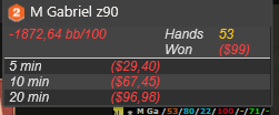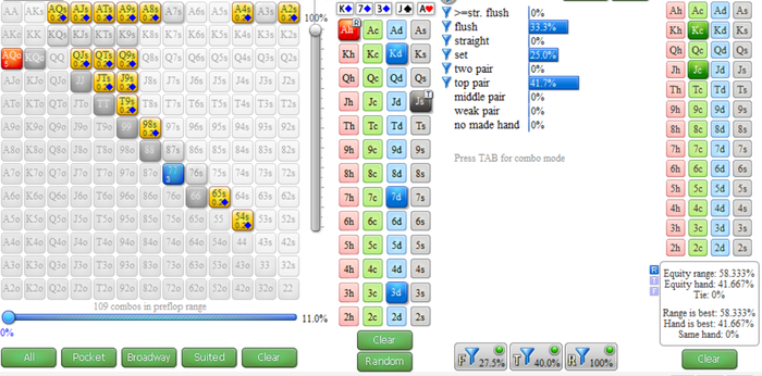 2) По - хорошему выходит фолд флоп, с 3бетом в 5-6% ему нужно проставлять всех тузов без бекдоров для достаточных для меня ПО, что маловероятно. могут и не влезть в ренж, а нижние СД я блочу.