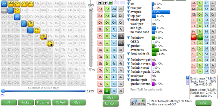 Simka, 1)На совсем голом бланке думаю это пуш или ч/к,по тузу ч/ф вполне себе опция. 2)против 5-6% просто фолд на флопе,или максимум 1 улицу тащить 3)Всё правильно говоришь,по такой структуре против агрессивного оптимальнее от чека играть и дальше смотреть.Очень много мерзких ситуаций может возникнуть,если прыгать от того как сыграно,то на тёрне можно смело фолдить. Там уже совсем всё плохо.