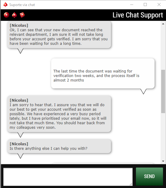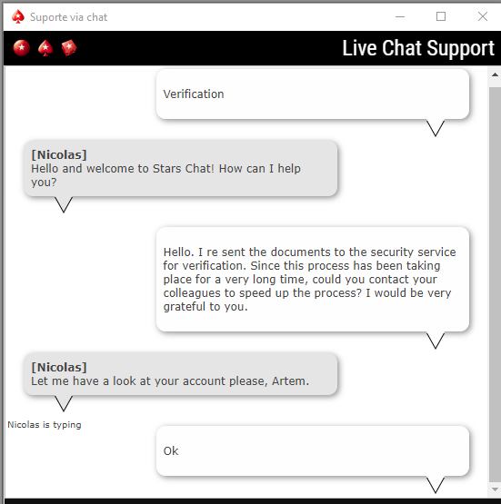 Как писал выше, данный пост будет об верификации и о том, какие документы лучше отправить в СБ рума PokerStsrs. Начну с самого начала в вкратце, для тех что не в курсе. И так, все началось 4 мая. Проснулся, думаю поставлю ка я на вывод деньжат немного, но получил отрицательный ответ, что меня очень возмутило, так, как, за многие годы игры такого не было! В письме которое я получил, было сказано, что необходимо подтвердить свою личность (та раз плюнуть, подумал я) Но все оказалось сложней, чем я думал, наверное это связано было в тот момент с их переездом и не стабильной работой службы поддержки. Документы отправил - копию прав и платежку за газ, с фамилией и адресом прописки. Ответа не получал долго.... а деньги то нужны, вот я решил засыпать их письмами, в которых начал ныть на жизнь и необходимость денег для жизни (чего делать НЕ РЕКОМЕНДУЮ НИ В КОЕМ СЛУЧАЕ!!!) И так, жду ответа Да есть же!!!! Правда радости мало, это был отдел про проблемным клиентам (суицидникам, лудоманам и т.д.) Началась новая история, в которой мне пришлось рассказывать, что я не лудоман и у меня есть нормальная работа, денег хоть жопойжуй, ну в общем классический трудяга среднего звена (и да, при этом, мне уже совсем запретили доступ к игре) После пары писем доступ к игре открыли, но я еще до сих пор не был верифицирован. Пришло письмо уже от СБ рума, в котором было сказано, что личность моя верифицирована, а вот место жительства нет Ну да ладно, хоть какой-то прогресс. Отправляю новый документ (выписку из банка с моими реквизитами на английском, правда без печати) Отправил я данное письмо 3 Июня. Ответа не получал до 16 числа, нервы сдали Решил письма не писать, а в лайв супорт черкануть пару слов. Работник попался понятливый, на мой вопрос "как долго ждать ответа от СБ", получил неожиданный ответ "Я сейчас свяжусь с своими коллегами и попрошу их ускорить процесс, оставайтесь на линии". Спустя пару минут, меня порадовали и сказали, что я получу ответ на протяжении дня. Правда ответ СБ меня не порадовал, все те же грабли, все не то. Позвонил в банк к своему агенту, рассказал что к чему, как оказалось я могу заказать справку о своем счете, где будут указанные все данные, которые меня интересуют (на английском). Сегодня я был настроен уже закончить данный вопрос. Загрузил файл в PDF формате (что БУДЕТ ПРАВИЛЬНО!) Но решил мальца схитрить, так, как опять ждать с моря погоды не хотелось Решил сразу после отправки в лайв супорт писать