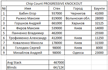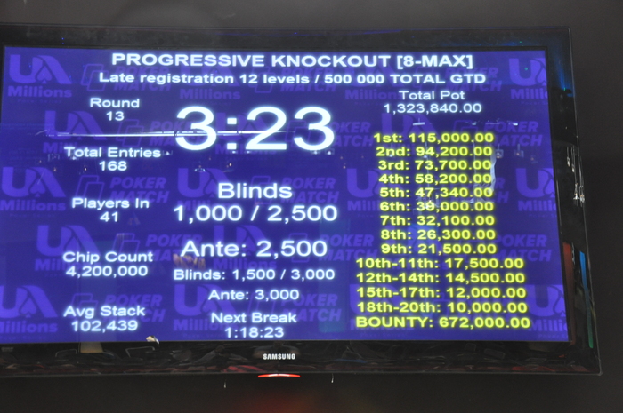 Завершилась поздняя регистрация в турнире Progressive KO! В турнир было сделано 168 входов. А общий призовой фонд составил 1 328 840 гривен! 50 бойцов продолжают игру.