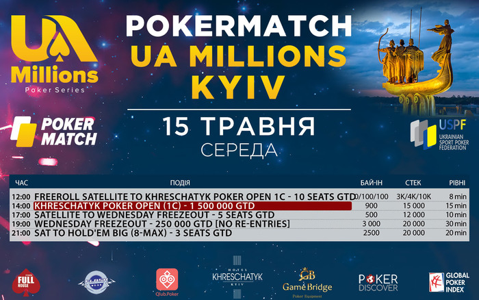 Наша серия перевалила за экватор и в ближайшие дни вас ждет еще много интересного! Программа на среду, 15 мая В 12:00 уже по традиции стартует фриролл-сателлит к турниру Khreschatyk Poker Open (1C). Отличный шанс побороться за внушительные призовые и начать свой путь к триумфу с бесплатного турнира! В 14:00 начнется турнир Khreschatyk Poker Open (1C) с гарантией 1 500 000 гривен! В 18:00 нас ждет развязка турнира Pregressive KO и очень интересный финальный стол. А в 19:00 стартует классический фризаут-турнир Wednesday Freezout (в 17:00 вы сможете отобраться в него в сателлите) Завершит программу дня в 21:00 сателлит в турнир хайроллеров Hold'Em Big с гарантией 1 000 000 гривен! "Крещатик" ждет своих героев!