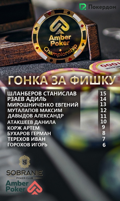 Напомню, что помимо кубков за победы в турнирах, есть ещё золотая фишка, которая достанется лучшему игроку APC по сумме баллов за Калининград Кап и Мэйн-ивента. Очки начисляются простым образом. В Калининград Кап было 15 призовых мест, соответственно победитель получил 15 баллов, за 2-е место полагалось 14, за 3-е - 13, и т.д. вплоть до 15-го места. Похожая схема будет работать и в Мэйн-ивенте за одним изменением: все очки будут начисляться с коэффициентом 1,5. Например, если зона ИТМ будет на 20 человек, то победитель турнира наберёт 30 баллов (20 за победу *1,5).