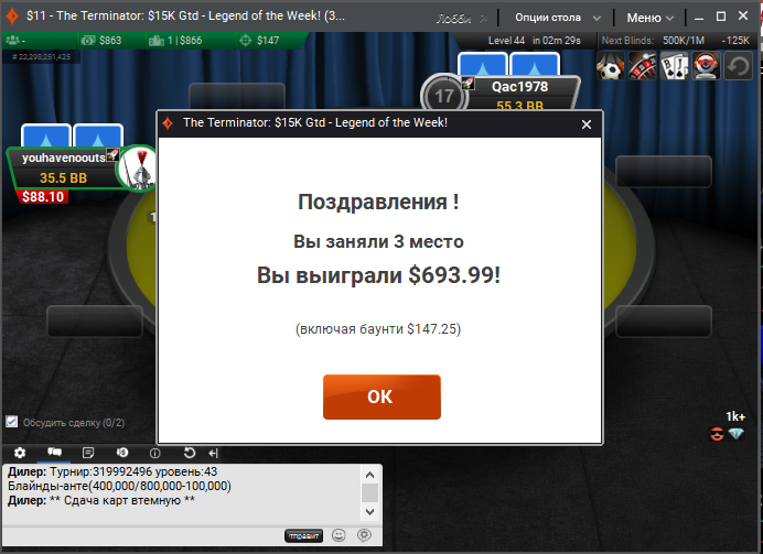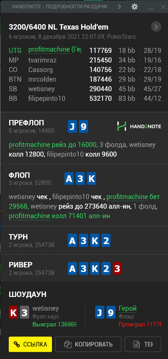Сегодня откатал 9 турниров, одновременно играл 6 столов, концентрация максимальная, всех оппов параллельно чекаю на шарке, чтобы понять вменяемый ли враг и как против него построить более плюсовый лайн. Резалт сессии +700$