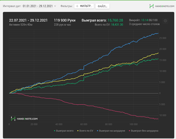 Первые 7 месяцев играл в 0, второй отрезок выдался более удачливый, взялся за дело, удалось налутать скромные тысяч 8 тотал за год с учетом кэша, в сравнении с первым своим годом покерного бойца 2020 года, который плюсанул 24к.