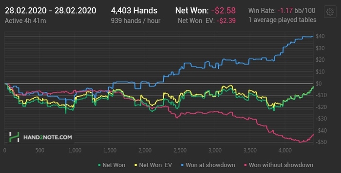 Сглазил. Сыграл чудовищно плохую замазочную сессию с D- качеством игры, еще и сдавали кошмарно на постфлопе. После того, как седьмой раз улетел на -20$, уже практически смирился, что не отмажу, но в самые последние 45 минут вдруг выдернули из кошмара и вернули в нормальный покер, где в твою оверпару не летит 10 раз из 10 рейз на ривере в 3-бет поте.