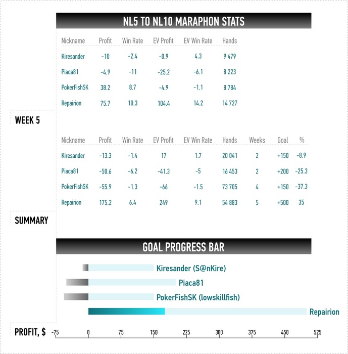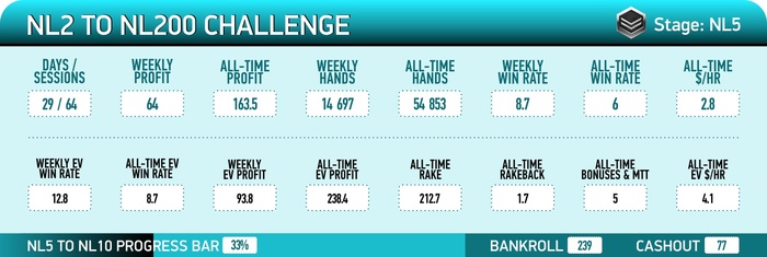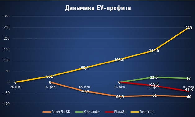Треть дистанции пройдена (по EV почти половина ). Но зато успешно выполнил планку по профиту двух других участников марафона (>150$) . Мне же еще пахать и пахать до 500-ки профита. График: #marathonNL2toNL200#reportNL5toNL10