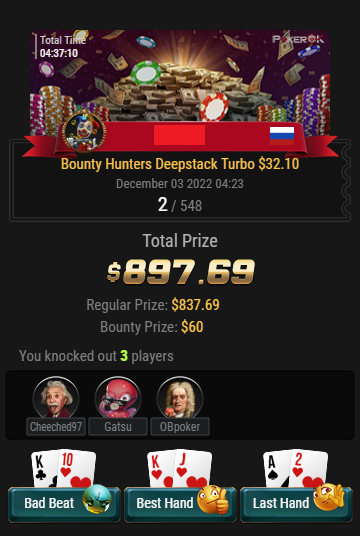 А сегодня вышел день АКР. В более дорогом с 8К за 1ое на предфиналке ушёл АКс в А8 префлоп. Но по 22 удалось вгрызться, и в ХА хлопнуть единственного фиша с финального стола.