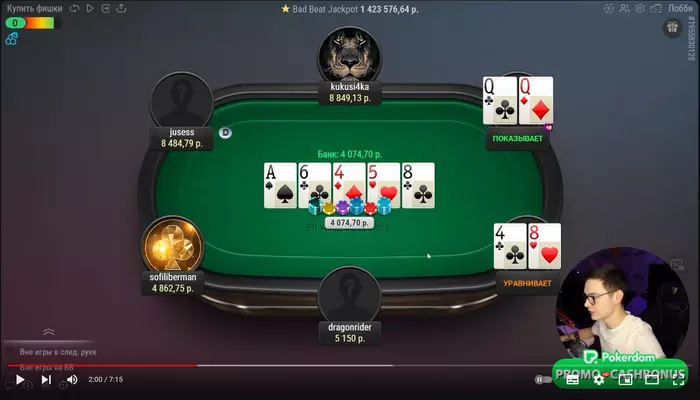 По риверу опп решает ставить недо олл-ин, герой радостно уравнивает и забирает 8000 рублей. Чисто на скилле переиграл 😎
