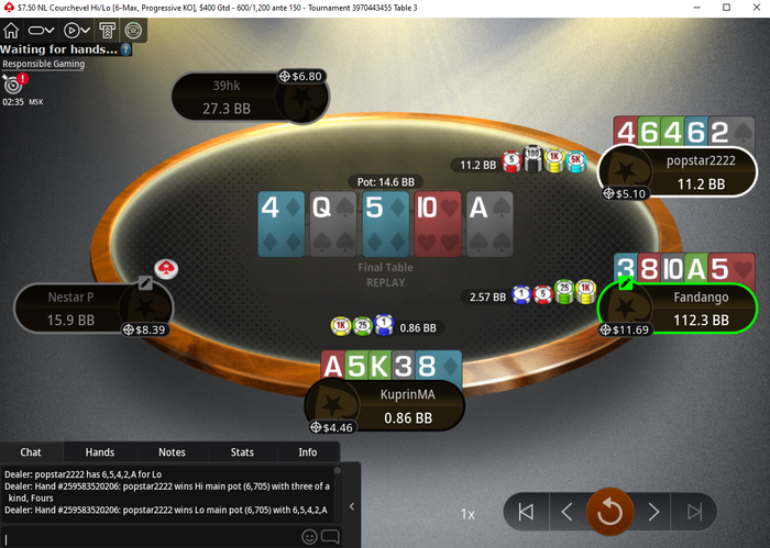 За прошедшие дни было много финалок, в т.ч. по холдему. Сшибаю по мелочи, но потихоньку увеличиваю БР, стараюсь приближаться к заветному пятизнаку. В холдем показываю хорошие винрейты, но по EV недобор 7 бб. Даже фуллы на каретах умудряются катать. В других играх тоже самое. Вчера вообще смешно было отобраться на хороший серийный бадуги за 55$ через сат, и во второй раздаче получить кулер 542А в первый натс 432А. С такой рукой я буду проигрывать примерно 1 раз на миллион раздач. В лоу версии уже в дипе в топ-30 иду чипаком с 1-ым стеком в турнире и за 10 минут получаю кучу кулеров, в одном из которых снова показывают первый натс 432А. В общем, остаётся только терпеть и продолжать играть в свою A-game.