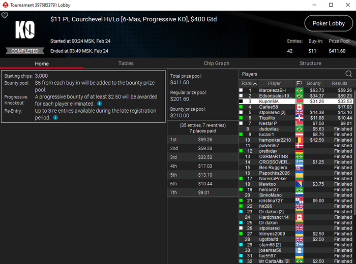 Думал, что по возвращению акклиматизация займёт какое-то время, но всё-таки сел сыграл сегодня небольшую сессию из трёх вечерних турниров. Сразу удалось выиграть куршевель хай-лоу. 💪 В бадуги тоже было близко, но там закончил 4-ым.