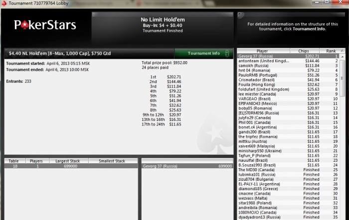 Poker Stars $0.91+$0.09 No Limit Hold'em Tournament - t25/t50 Blinds - 9 players -