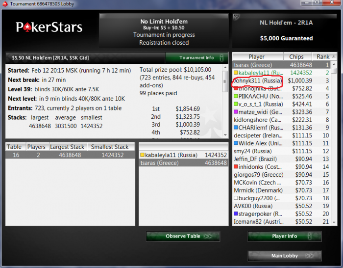 Совсем кстати мало сейчас играю, как-то настроя совсем нет, сегодня прилично увеличил АБИ, но турниры подороже встретили не ахти, хватило всего на 3 часа реги, даже теперь не знаю, играть завтра вск или нет, хотя вроде больше и делать то особо в нашем сраном городе нечего, только бухать да и все...