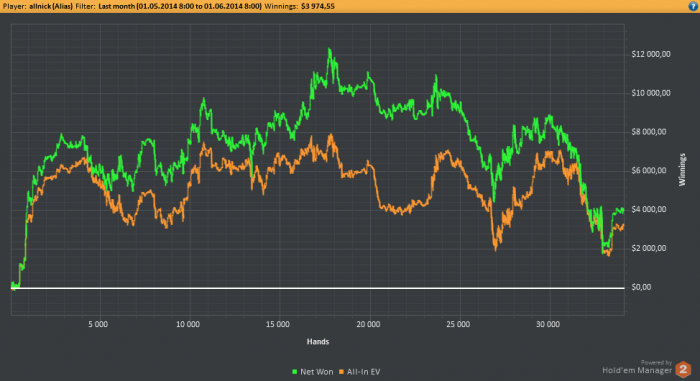 Ну и немного про покер. Прошлый месяц я отыграл 34к рук, что пока вроде как вообще мой рекорд по количеству сыгранного.