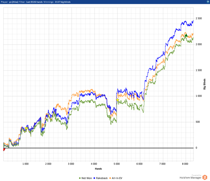 Ну я редко играю 1 стол. для меня нормальной является ситуация 1-2 со слабыми на мой взгляд регами + 3-4 стола с фишами(в пике я как-то словил момент игры на 10 столах, но это редкость конечно). К тому же я открываю все лимиты от нл50 до нл200 я стримил регвары некоторые. С конфы говорили, что я быстро кликаю и играю. Все это в купе дает такой результат