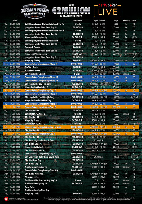 German Poker Championship - €1 Million Guaranteed, €2000 + €200 Buy In, Online Day 1 is 6th August – 2 Live Day 1s starting 10th August with Final Day 14th GPC Super High Roller - €500,000 Guaranteed, €25,000 Buy In,12th-13th August GPC 8 Max High Roller - €250,000 Guaranteed, €5,000 + €300 Buy In, 9th-10th August GPC 8 Max - €200,000 Guaranteed, €2,000 + €200 Buy In, 12th-13th August GPC 6 Max - €100,000 Guaranteed, €2,000 + €200 Buy In, 13th – 14th August Ca$hKing$ - The infamous high stakes live streamed cash games,10th-11th August GPC Mini – €200,000 Guaranteed, €200 + €20 Buy In, 11th-13th August