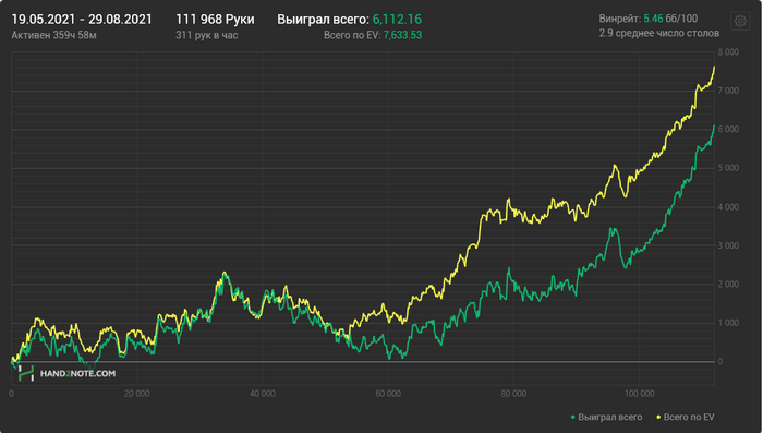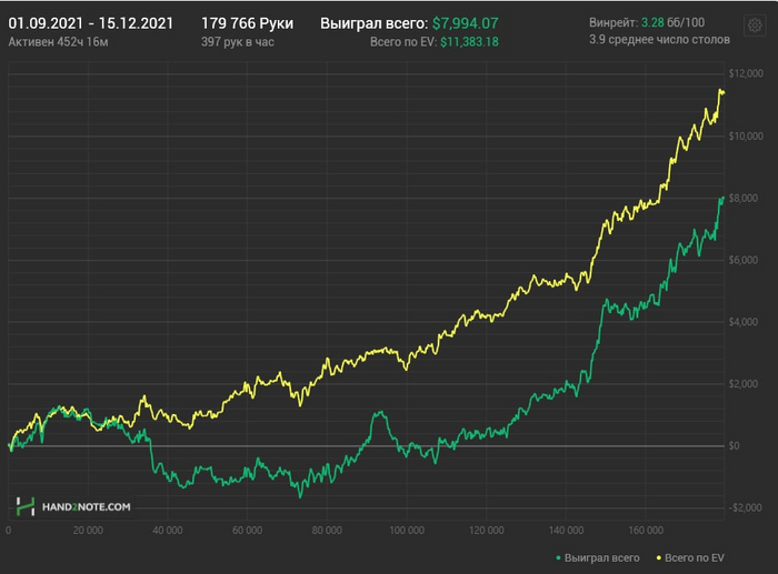 График с 1 сентября . Тут отчетливо видны два отрезка , первый в даунстрике ~ 120к рук и 2.5 месяца катки в ноль при винрейте на сотке около 8.5евбб . Второй в апстрике ~60к рук чуть больше месяца. Как же все таки влияет диспа это жесть . Поэтому когда попадёте в такой отрезок надо просто терпеть и когда нибудь начнется апчик.