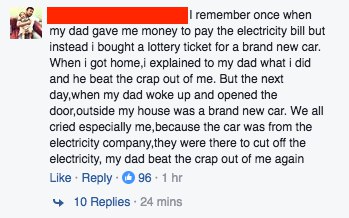 Я помню, как однажды, когда мой папа дал мне денег, чтобы оплатить счета за электроэнергию, но вместо этого я купил лотерейный билет на новый автомобиль. Когда я вернулся домой, я объяснил моему папе, что я сделал, и он выбил дерьмо из меня. Но на следующий день, когда мой папа проснулся и открыл входную дверь, возле моего дома был совершенно новый автомобиль. Мы все плакали, особенно я, потому что машина была из электрической компании, они приехали чтобы отрезать электричество, мой папа снова выбил дерьмо из меня.