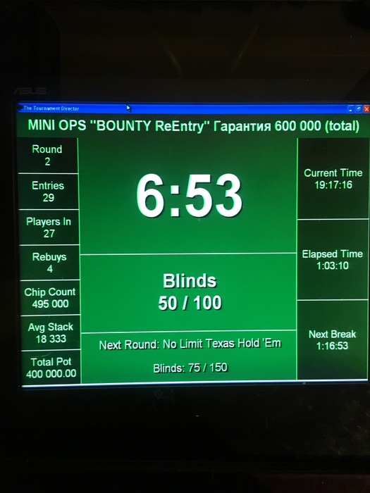В Bounty закончился период регистрации и ReEntry В турнире приняло участие 33 человека, видимо сказались погодные условия (за прошедшую ночь выпало огромное кол-во снега и добраться до нас было тяжеловато) Тем неменее в розыгрыше 450 000 руб основного призового фонда и 250 000 bounty фонда