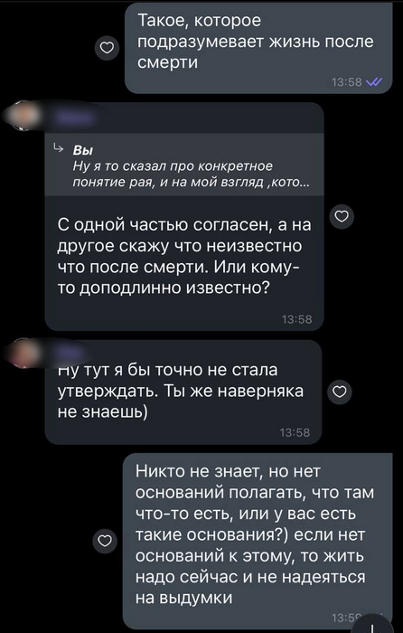 Такой же, ну такой же вопрос: есть ли жизнь после смерти? Поразительным образом те, кто находит для себя возможным считать, что идёт освобождение Украины, находят доказательства существования жизни после смерти. Просто почитайте часть нашего разговора в чате с родственниками (моего возраста) на эту тему.