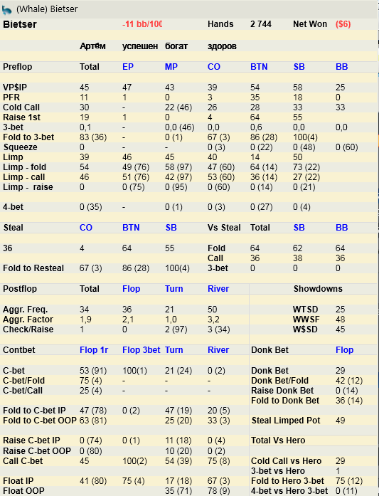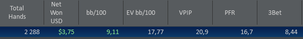 MP: $2.19 - VPIP: 21, PFR: 15, 3B: 6, AF: 2,5, Hands: 885