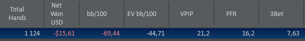 BTN: $1.31 - VPIP: 26, PFR: 21, 3B: 13, AF: 2,7, Hands: 117