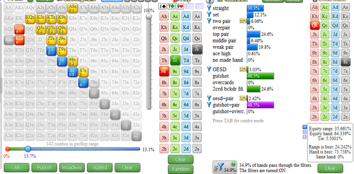 В ренже СС у него много Ахs, KQs,QJs, все карманки (AQo/AJo тоже наверн колит префлоп) Конкретно с любой дамой к риверу может "хироколить" потому что блочит твои АД,АВ,КД и проигрывает на ривере он только сетам. Которые вряд ли слоуплеятся на флопе без позы в стеках 17бб от Тебя.