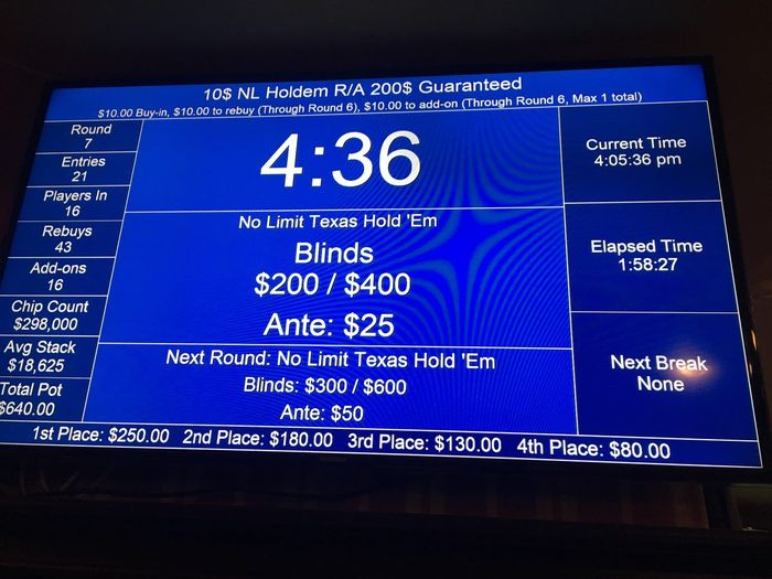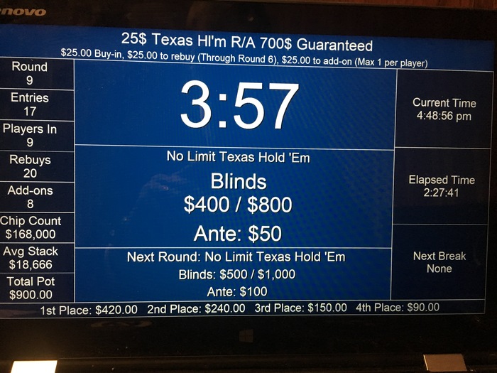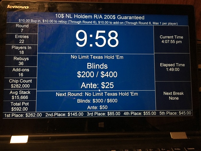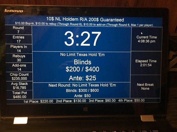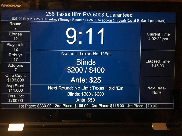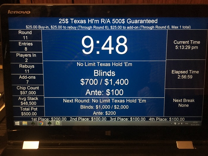 8 человек приняло участие в дневном турнире. Два человека воспользовались правом бесплатного стека. Призовой составил 500$ Оставшись вчетвером, было принято решение поделить.
