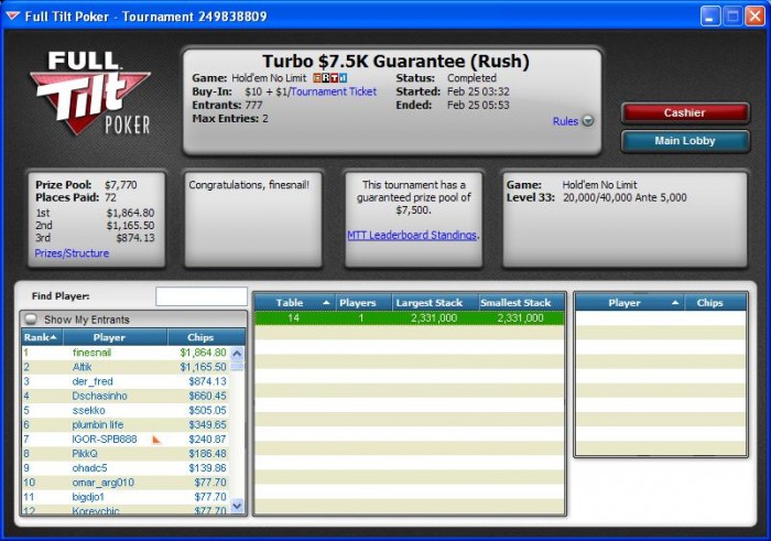 Full Tilt Poker No Limit Hold'em Tournament - t300/t600 Blinds + t75 - 6 players -