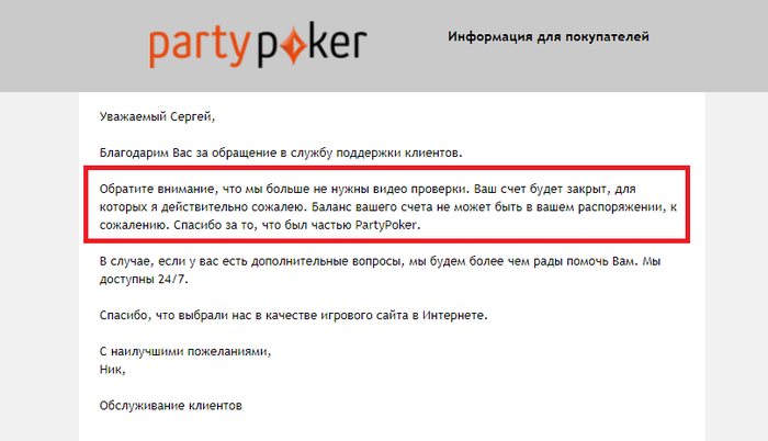 Готов поставить деньги на то, что Party тебе забанили аккаунт с конфискацией без аргументированных подозрений/оснований? В пределах 1000$ инста вколю.