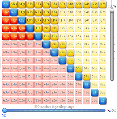И вот хуй его знает на самом деле как лучше дэфать , по математике мне кажется слишком широко получается , мы часто будем просто чек фолдить на флопе , да и из-за рейка не факт , что вообще имеет смысла так сильно изъебываться.