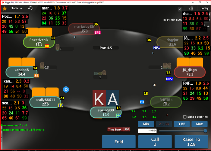 Месяц идет плохо, БР с начала марафона = 27 239$!!! По блайндам все тоже не космос, но тут порешали плохие составы на сериях + многостоловый гринд, из-за большого количества турниров часто увлекался и грузил больше положенного, от сюда и просадка в качестве, сейчас буду исправляться.