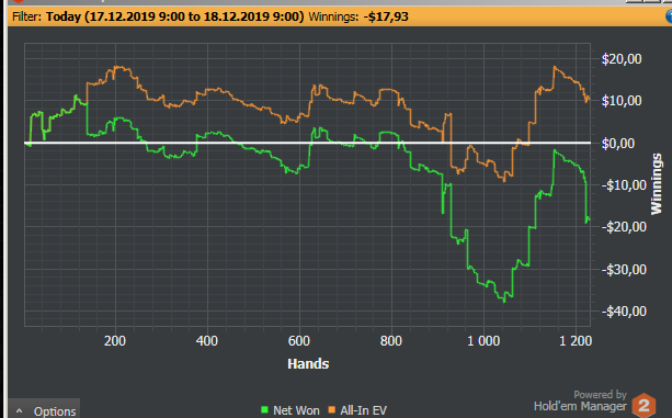 вау, что за день, спокойненько за первые 3 часа сделал + 12, а на вторую сессию такой херни натворил, что за пол часа уехал в -30 + страховку на жадности не взял (думал отыграться АJ vs JQ фишовские на 80бб) и конечно, раздачу проиграл. Чет вогнался в тильт, но посидев немножко оправился. День в -12$ обошелся)
