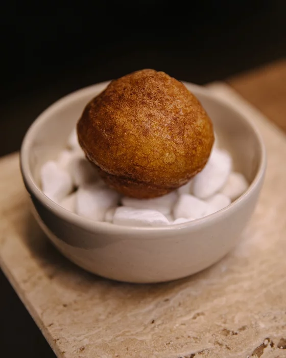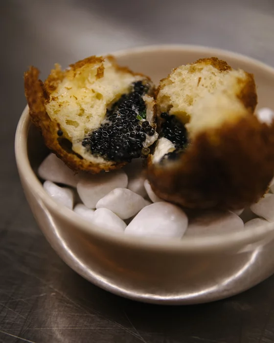 Первым блюдом был пончик с щучьей икрой. Внутри пончика — домашняя сметана и, собственно, щучья икра. Также в ресторане можно заказать и вариацию с черной икрой, но по словам официанта они пришли к выводу, что щучья более уместна. Готовят его 2 человека и сложность приготовления заключается в том, чтобы тесто успело приготовиться, а начинка осталась холодной. Я не очень люблю жареное тесто, поэтому не отнесу эту позицию к моим фаворитам, хотя сочетание вкуса жирной сметаны и соленой игры понравилось ожидаемо. Ну и за оригинальность плюс, конечно. Фото начал делать позже, поэтому приложу иллюстрацию из инсты снова.