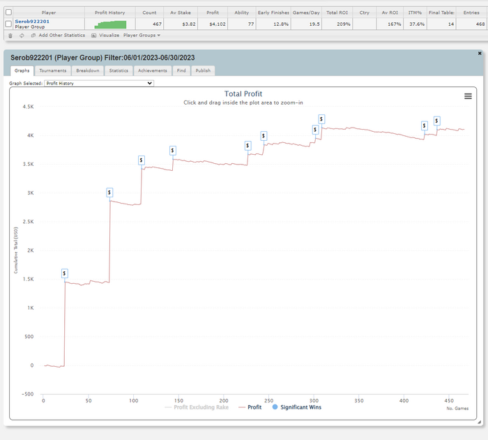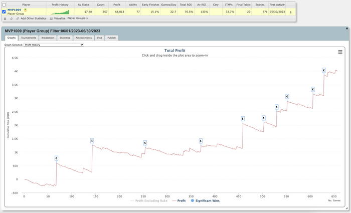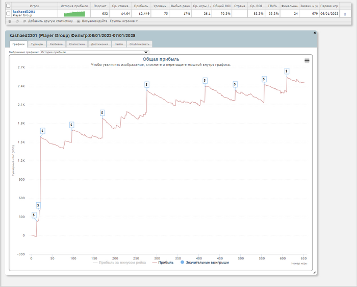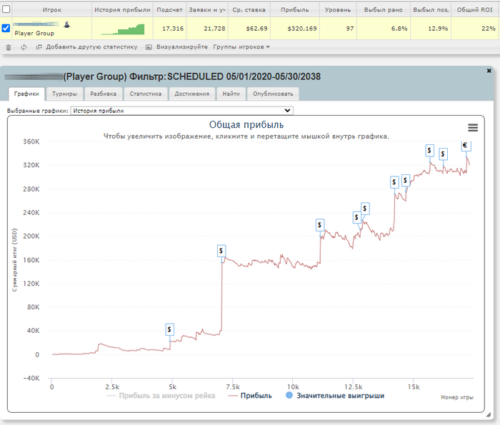 Общая статистика, где кроме важных статов вроде РОИ и EV можно найти много другой полезной информации. Например, сколько осталось до истечения контракта или сколько игрок в среднем катает турниров в день.