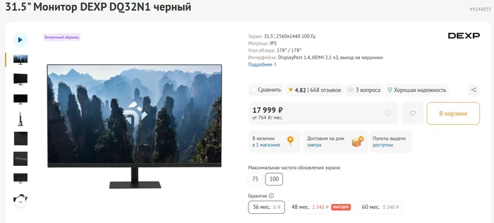 Если же подумать в сторону монитора побольше, то среди 32” Dexp тоже «царь» бюджетных вариантов. Разрешение 2К, частота 100 Гц и вполне приемлемые характеристики + гарантия 36 месяцев.