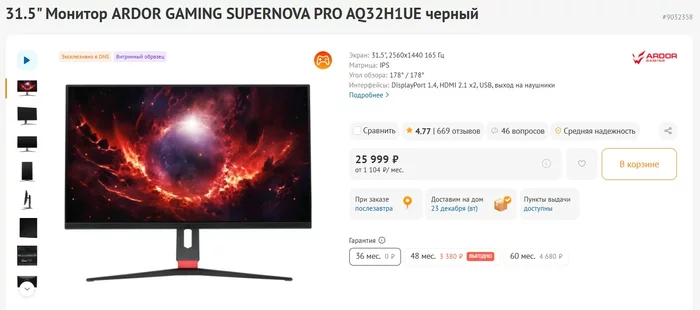 Из 27” — это два варианта. Первый — самый бюджетный, но вполне неплохой вариант от ДНС, а именно монитор их фирмы Dexp. Хорошие отзывы, неплохие характеристики, 36 месяцев гарантии.