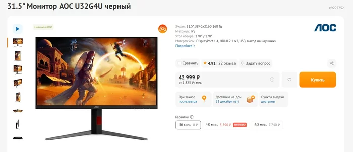 Если же есть возможность рассмотреть мониторы с разрешением 4К, то один из неплохих и относительно недорогих вариантов — это вот этот AOC. Здесь и характеристики хорошие: матрица 10 бит, частота — 160 Гц, яркость — 450 кд/м², и отзывы положительные, 3 года гарантии. Но для него, как я и говорил, нужна видеокарта, которая будет адекватно с ним работать.