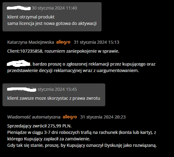 В общем вернемся к винде, приходит посылка и.... Бокс с виндой сука вскрыт и на флешке нет наклейки одноразовой. Думаю нихуя себе охуели. Пишу сразу отзыв продавцу на алегро, пишу что буду делать возврат, прошу вернуть деньги, открываю спор. Итог - продавец попросил УДАЛИТЬ ОТЗЫВ, сказал забирать этот вскрытый бокс себе и не возвращать ему, сказал вернет деньги, как только я удалю отзыв. Я аж офигел от такой наглости, написал в поддержку алегро, что так и так просят удалить отзыв и тогда вернут деньги, но какого хуя? Поддержка алегро ответила в духе: "Чего ты до всех доебался? Удали отзыв, получишь бабки и не еби никому голову!" ))))))))) Понятно, что в вежливой и культурной форме. Магаз так вообще включил в споре дурака - все было окей, все запаковано, но мы вернем бабки как удалит отзыв. В общем отзыв удалил, бабки вернули, коробка осталась. Ну а продавец дальше банчит уже юзаными боксами софта. Винду эту, кстати, можно было активировать и все работало. НО! У меня без проблем подтянулась активация со старой 10 винды и в итоге этот бокс пока лежит не применённый.