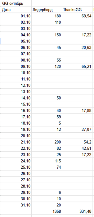 5) Рейкбек от аффилейта. Я зарегался на GG в том числе и ради этого. Афф мне предложил 30% от NET рейка. За все время от аффа пришло 1554$. Но чтобы вы понимали, за последний месяц мне пришло 40,37$ )) И я не сомневаюсь в честности аффа. Им инфу дает GG и они исходя из нее и высчитывают мой рейкбек. "Слишком много выиграл" видно за октябрь. Под спойлером сколько за октярь намесил рейка: