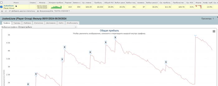 Во второй половине месяца вроде оклемался, желание катать стало постепенно возвращаться. После фриза на гг, основным румом по загрузке стал Winamax. Не очень импонирует, чтобы все турниры проходят в 6max формате, поэтому пришлось сократить пик одновременно играемых столов до 7. Пока результаты оставляют желать лучшего + накладывается отпечаток большого процента играемых турбин, относительно других румов, но думаю что на дистанции график должен выправиться. Помнится в своё время я так же сетовал на Redstar, а теперь это рум с самым плавным графиком в 30 градусов после 2000 турниров.