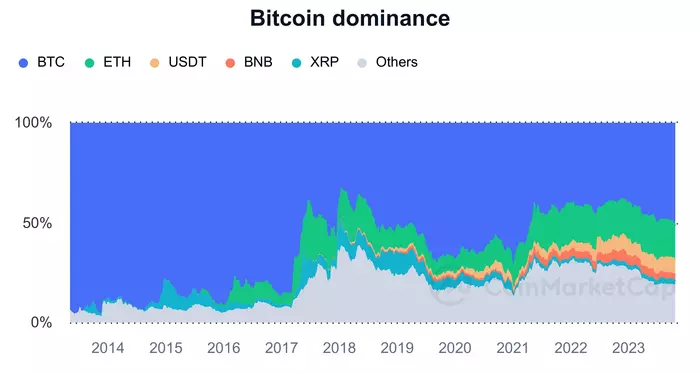 В январе этого года доминация была 38%, а сейчас достигла 53% - максимальный показатель с ноября 2021 года.
