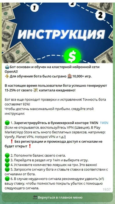 Визуал где-то спиздил и поменял через нейросеть, описание мейн спиздил в другом месте, описание инструкции было в первой итерации бота. Вообще, посмотрев каких ботов выкатывают профики- это все еще детский сад, но на текущем этапе это лучше чем у большинства. На следующем этапе напишу своего с нуля прям с полным фаршем.